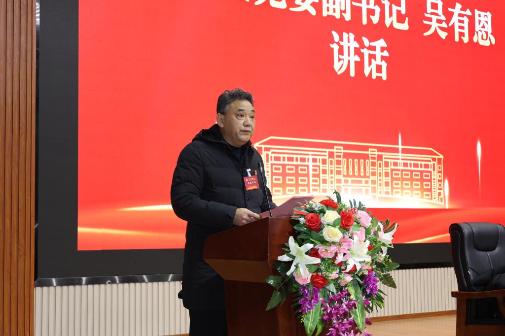 吴有恩发表讲话。他代表学校党委祝贺大会顺利召开,并对新一届学生会干部提出三点期望:一是聚焦政治引领,做新时代理想信念的坚定信仰者;二是切实履职尽责,做同学们贴心服务的忠实践行者;三是加强自身建设,做学生组织勇担使命的模范引领者。