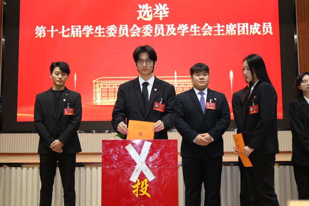 会上通过投票选举,王哲宇、阮依婷、杨涛、何颖、宋宇豪、林辉翔、周志慧、周思益、周家立、郑旭东、官嘉怡、胡筱韵、柯雨曦、柯晨垒、洪紫萱、黄婕、黄靖文、储润培、雷菲菲、熊心怡当选第十七届学生委员会委员,王哲宇、林辉翔、洪紫萱、胡筱韵当选第十七届学生委员会主席团成员。