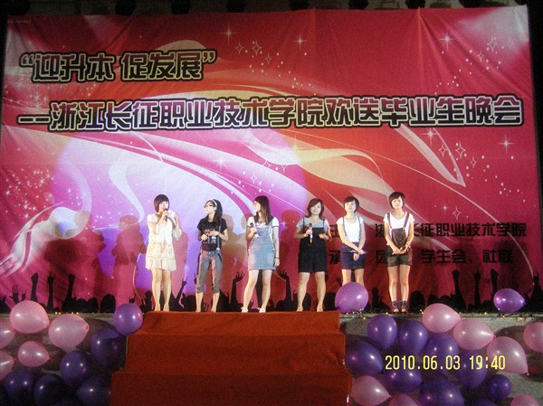 为了促进我院师生以崭新的精神风貌迎接美好的未来。2010年6月3日晚,我院在体育馆举办了“迎申本,促发展”——浙江长征职业技术学院欢送毕业生晚会。学院副院长贺旭辉教授、副院长王其军教授、院长助理杜丹副教授、人事处处长黄涛、学生处处长刘东副教授、副处长陈楠荪、学生处副处长兼团委书记陶元以及各系部等领导及部分师生出席了晚会。